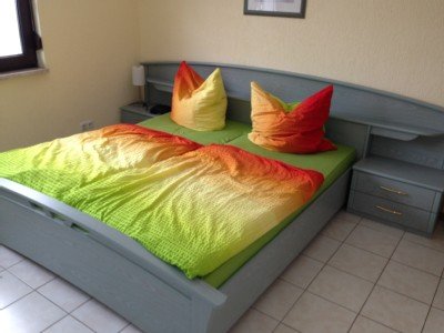 - Schlafzimmer im Erdgeschoß mit Doppelbett und großen Schränken