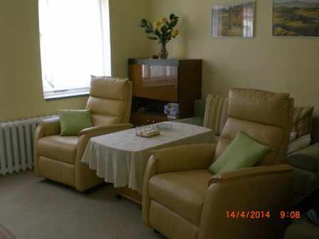 Wohnung 1: in der 1. Etage/Paterre (1-3 Personen) Wohnzimmer mit TV, Radio, Schlafsessel Schlafzimmer Küche mit Esstisch, Mikrowelle, Geschirrspüler Flur Bad Veranda