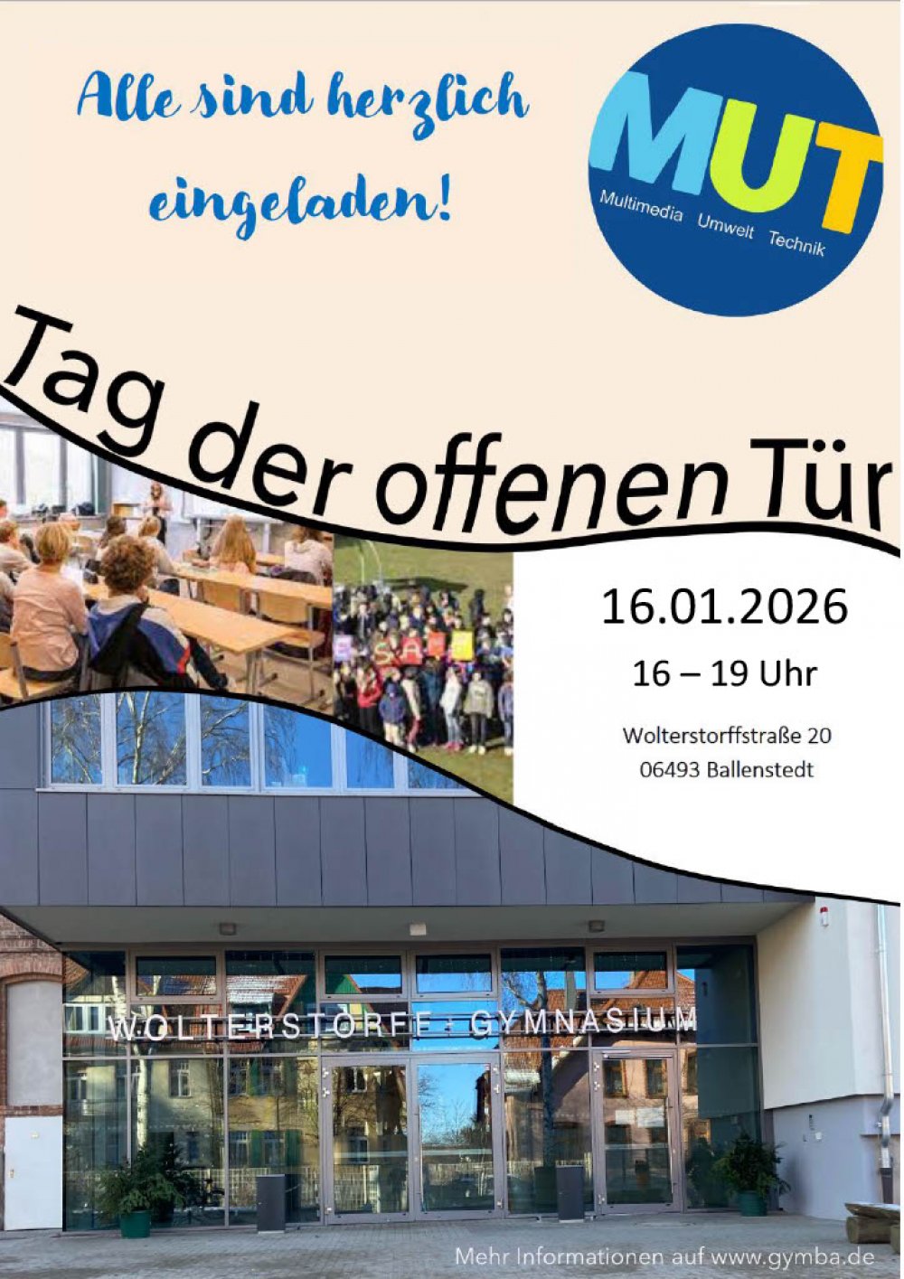 Am Freitag, dem 16.01.2026, öffnet das Ballenstedter Gymnasium in der Wolterstorffstraße seine Türen. Von 16 Uhr bis 19 Uhr können an diesem Tag alle Interessierten, besonders die zukünftigen Gymnasiastinnen und Gymnasiasten, die Räumlichkeiten der Schule erkunden.